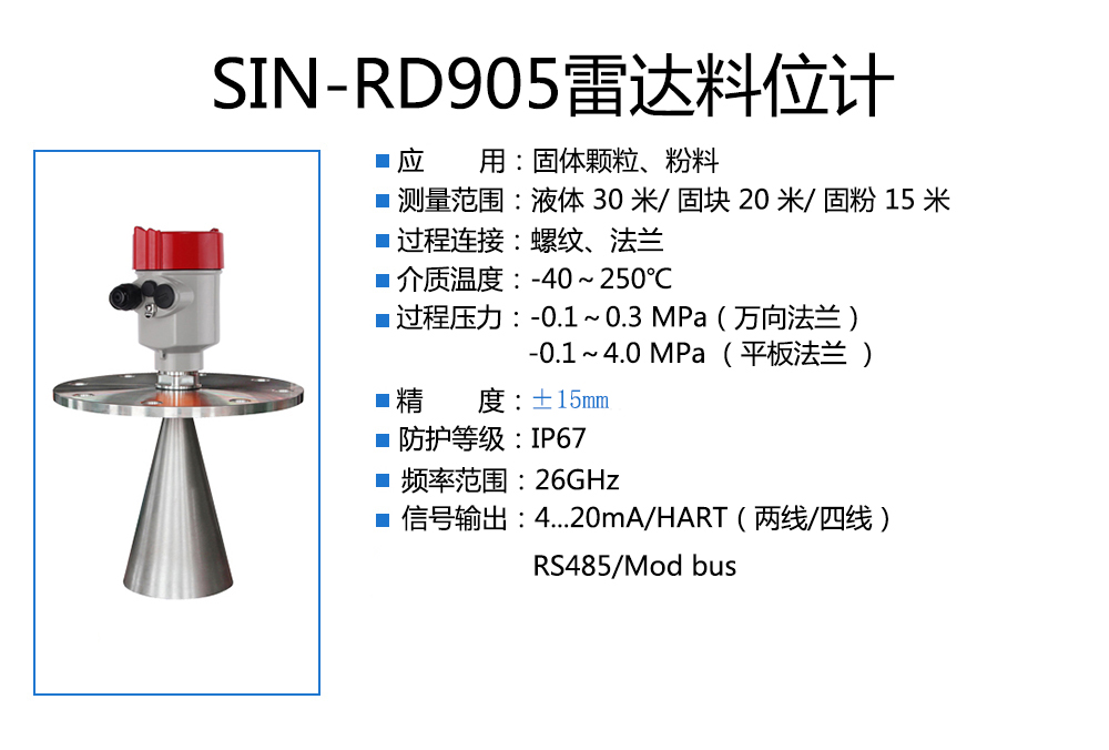 當前位置:首頁 > 雷達液位計  >  SIN-RD905雷達料位計_適用于固體顆粒、粉料_